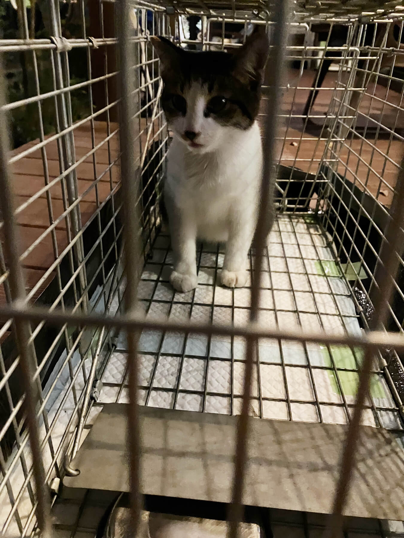 自分で捕獲機に入った。兄弟猫が、寄り添っていた。 |