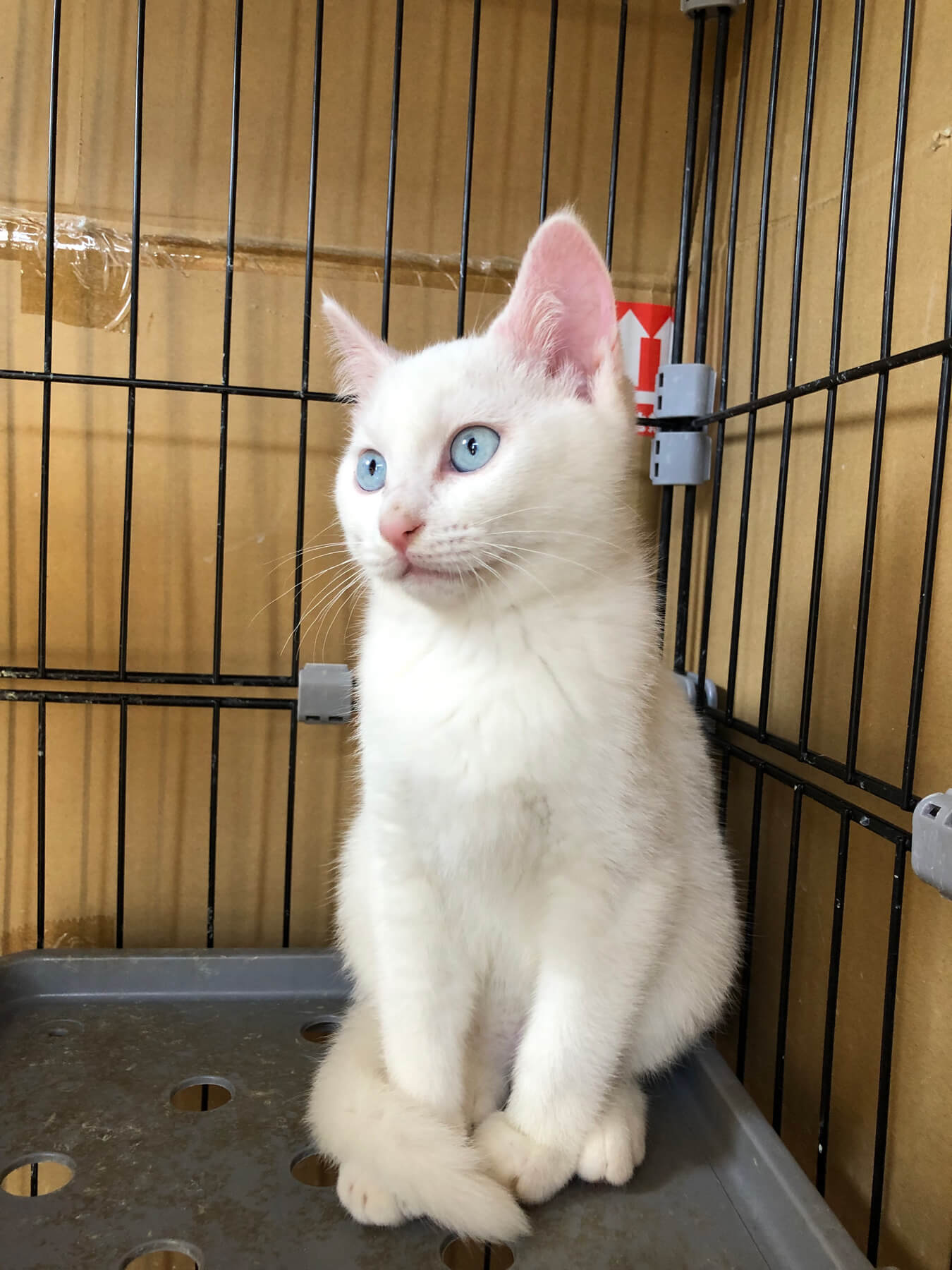 妊娠した野良猫が玄関先で出産したため、母猫と一緒に保護しました。2匹産まれたうちの1匹で、真っ白で青い瞳のとってもきれいな女の子ですが、譲渡先が決まりました。 |