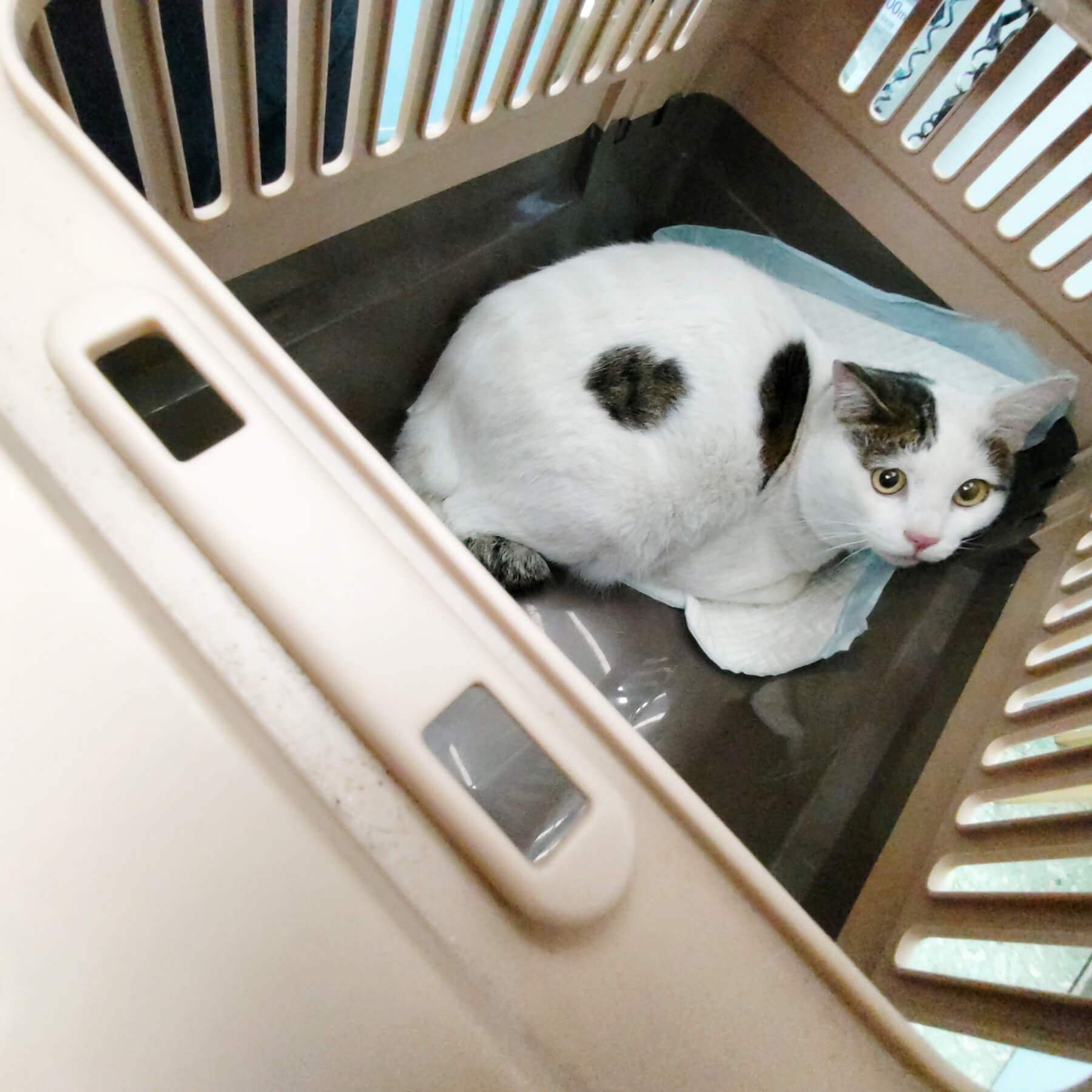 この度はハナプロを利用させて頂きまして誠にありがとうございました。冬から時々自宅の周辺に来るようになった白地に黒ブチの大柄な子です。仕事の休みを利用して自宅脇に捕獲器を置いたところ、中でご飯を食べていることが確認できました。 |