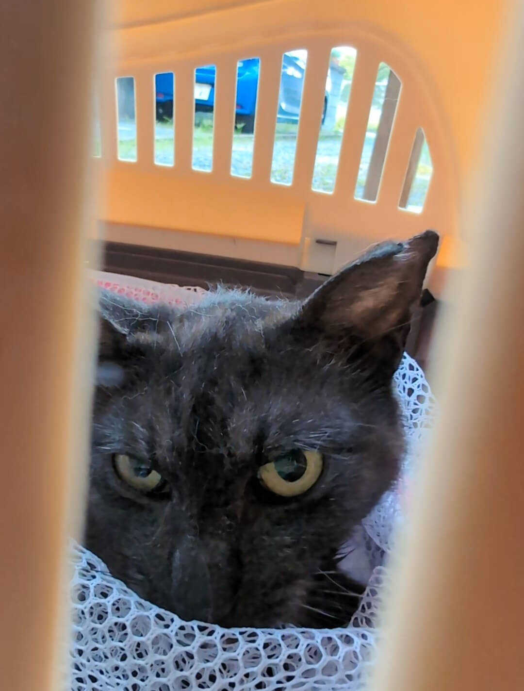 捕獲に入ってすぐは暴れていたが、それ以降、病院から帰ってくるまでずっと落ち着いていました。普段1メートルくらい距離をとられ、触らせてくれない子ですが、こちらを攻撃することもなく、大人しくしていました。 |