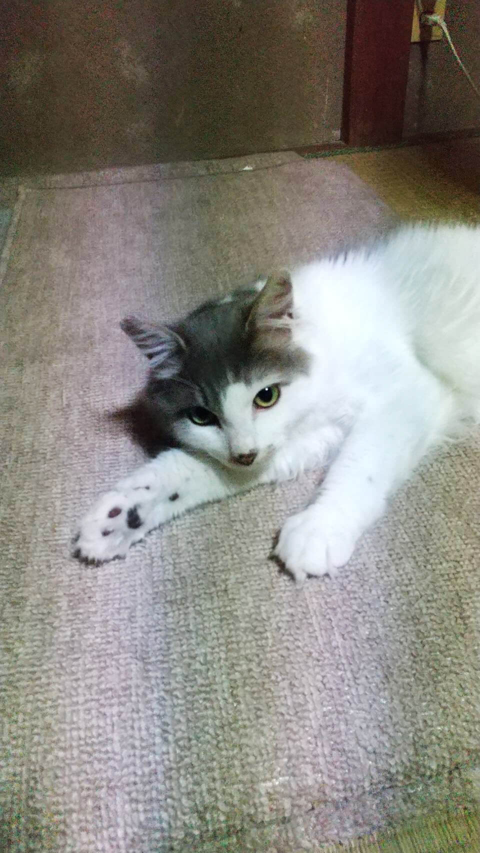 家で飼っている老犬に懐いて、居着いてしまいました。とっても仲良しで、冬は、犬の懐にくっ付いて寝ていました。ただ、早く去勢手術をしないととは思っていましたが、なかなか人には捕まらなく、捕獲器でやっと保護し、去勢手術をして頂きました。 |