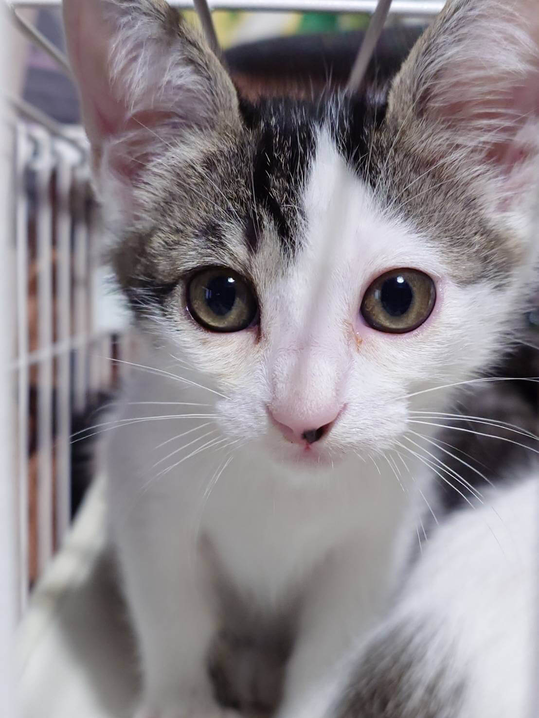 家の前の道路で熱中症でぐったりして動かなかったので保護。姉弟三匹のうちの仔猫ちゃんです。 |