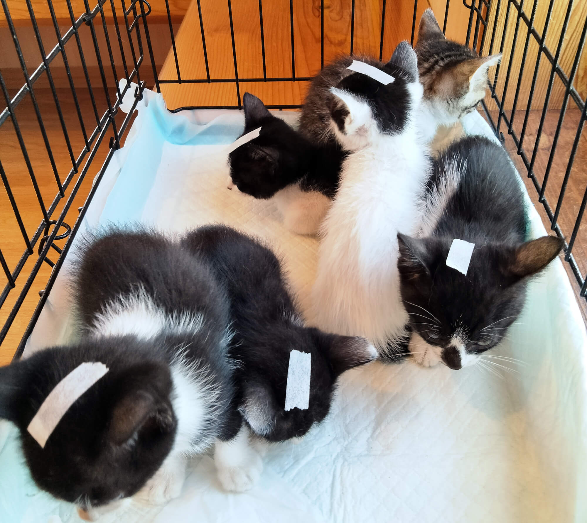 みわ動物病院 独居高齢者の自宅周辺で猫が多頭になり困ってると相談受けTNR中、避妊が間に合わずに産まれた子猫達です。 |